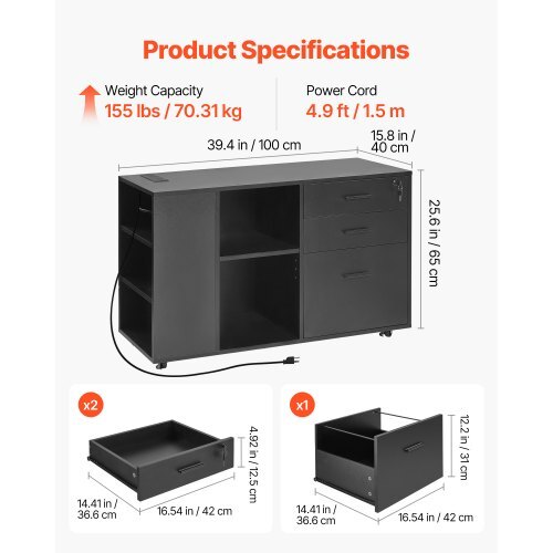 3 Drawer Wooden File Cabinet, Mobile Filing Cabinet with Power Strip, Lockable Rolling File Storage with Adjustable Shelves & 5 Wheels, Floor Standing Printer Stand for Home Office School, Black