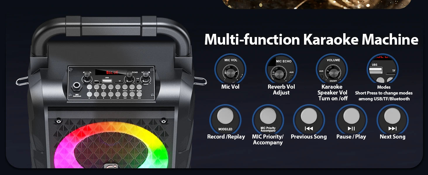 T18 High-Power Karaoke Bluetooth Speaker Music Rhythm Light Supports U Disk/Tf Card/Bluetooth/Aux Input/Wired Microphone/Wireless Microphone with Dual Microphone Surround Wireless Subwoofer