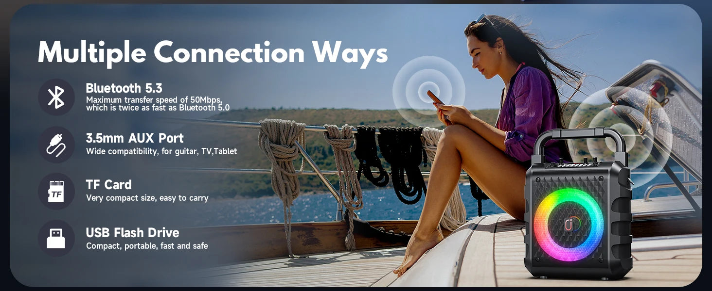 ADVANCED DSP CHIP & BLUETOOTH 5.3: Our professional karaoke machine features the latest DSP chip, designed to intelligently enhance sound quality for crystal-clear vocals and perfectly balanced audio. Paired with cutting-edge Bluetooth 5.3 technology, it delivers lossless audio transmission, minimizes latency, and ensures seamless synchronization between your voice and the music.