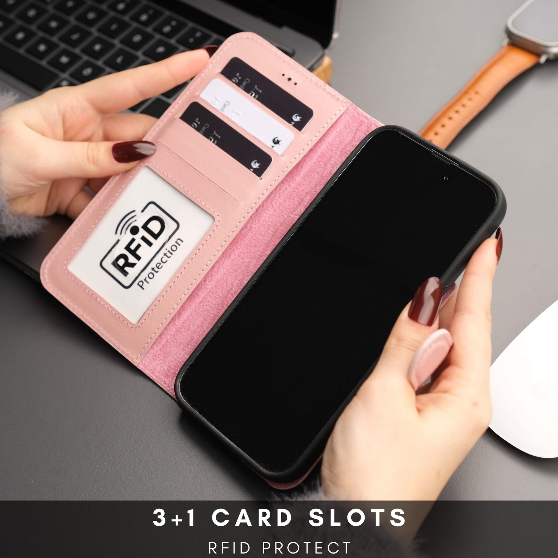 This wallet phone case protects against scratches and shocks from inadvertent drops. It is crafted with fine full-grain leather with exquisite attention to detail. Its attractive appearance and remarkable durability set it apart! With enhanced data protection, comfortable viewing, and smooth, continuous wireless charging, the integrated kickstand, RFID blocking technology, and detachable back cover provide a superior user experience.