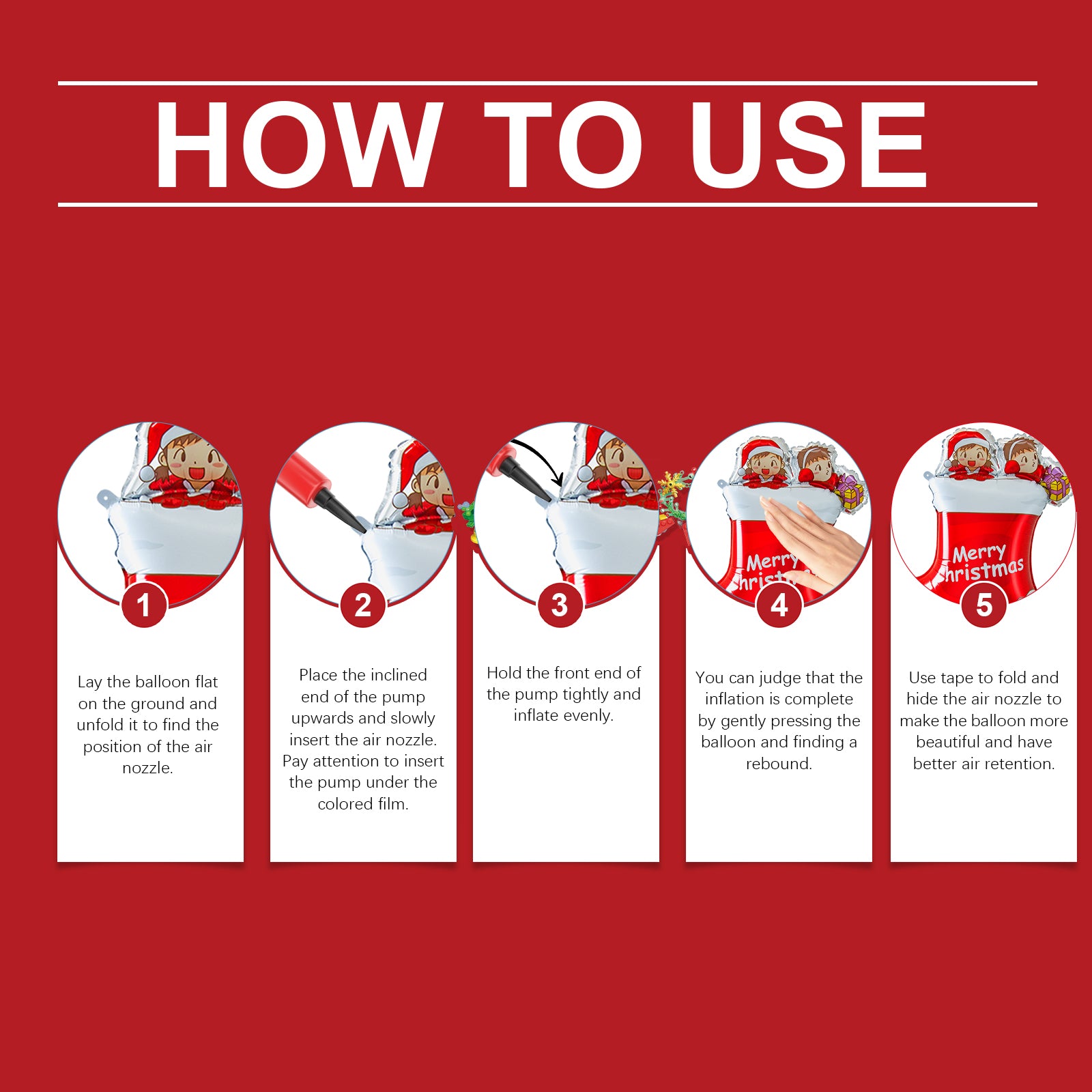 Our Santa stocking balloons contain nylon aluminum foil. This set of balloons consists of nylon aluminum foil material, puncture resistant, can be inflated for a long time to maintain the perfect shape, not easy to leak, suitable for indoor and outdoor use. Classic Christmas shapes such as Santa Claus, elk, snowman and so on. Add a Christmas atmosphere to your home or party. Its use is simple: put the bevel on the front, as you can judge, fold and hide the air nozzle with tape to make the balloon more beautiful, lay the balloon flat on the ground, open it, and find the location of the air nozzle. Take care to insert the gas cylinder under the colored film. Gently press the cylinder, find the restraint, and inflate it. Better air retention. And the material is thick, self-sealing without leakage. It can be kept for a long time and can decorate the house.