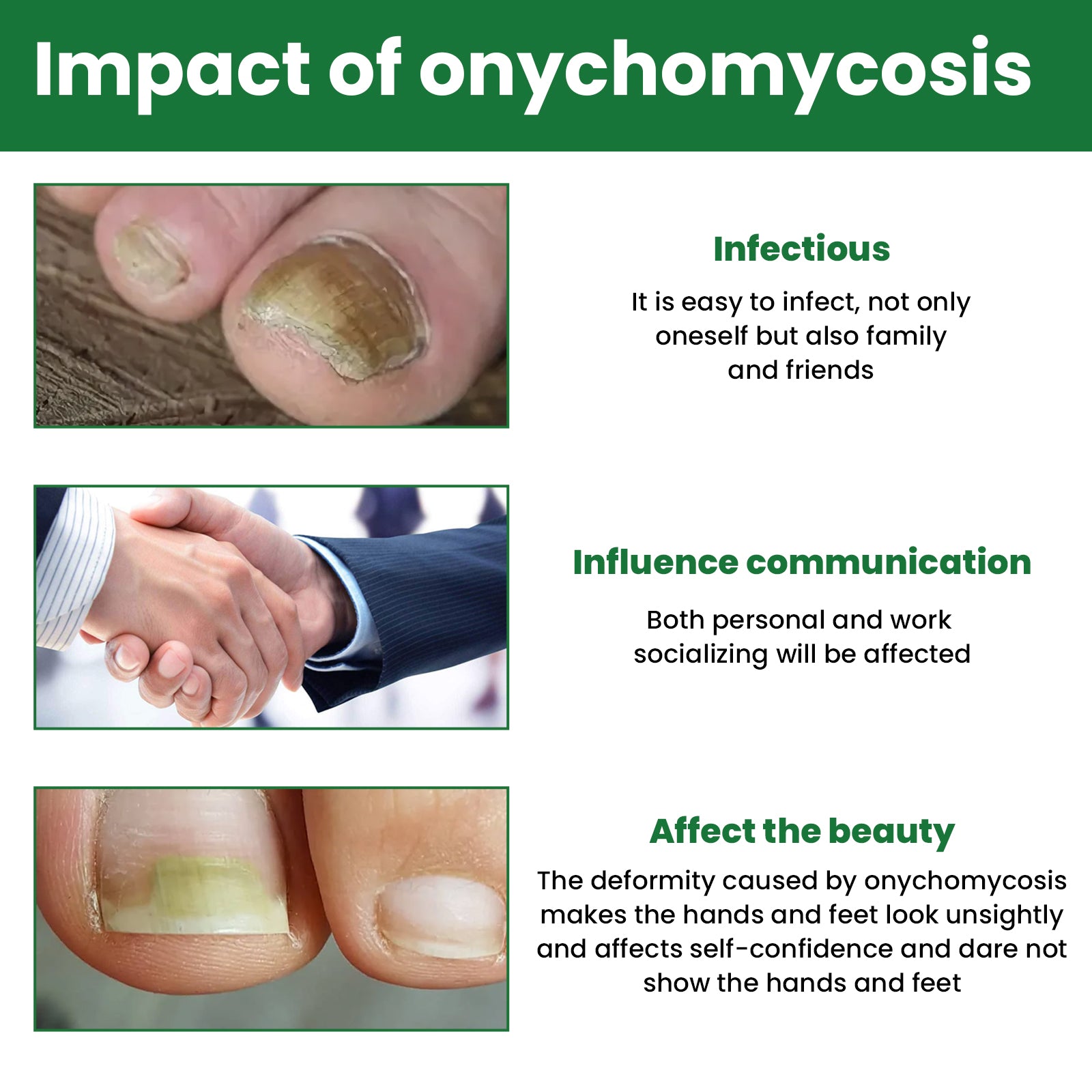 Our Gray Nail Repair and Nail removal Nourishes contain acetic acid, disodium EDTA, and matrine root extract. It can disinfect and repair damaged tissue and restore the smooth and glossy state of the damaged area. Accelerate the growth of new nails, accelerate the metabolism and growth of finger (toe) nails, and provide nutrients for new nails. Its use method is very simple: the first time to use, first soak the sick nail in warm water, then use a file to whiten the irregular nail, and then drop the right amount of this product, slowly penetrate the diseased nail, and finally keep one drop in the morning and one drop in the evening. Use it until it heals. And can repair nail care.
