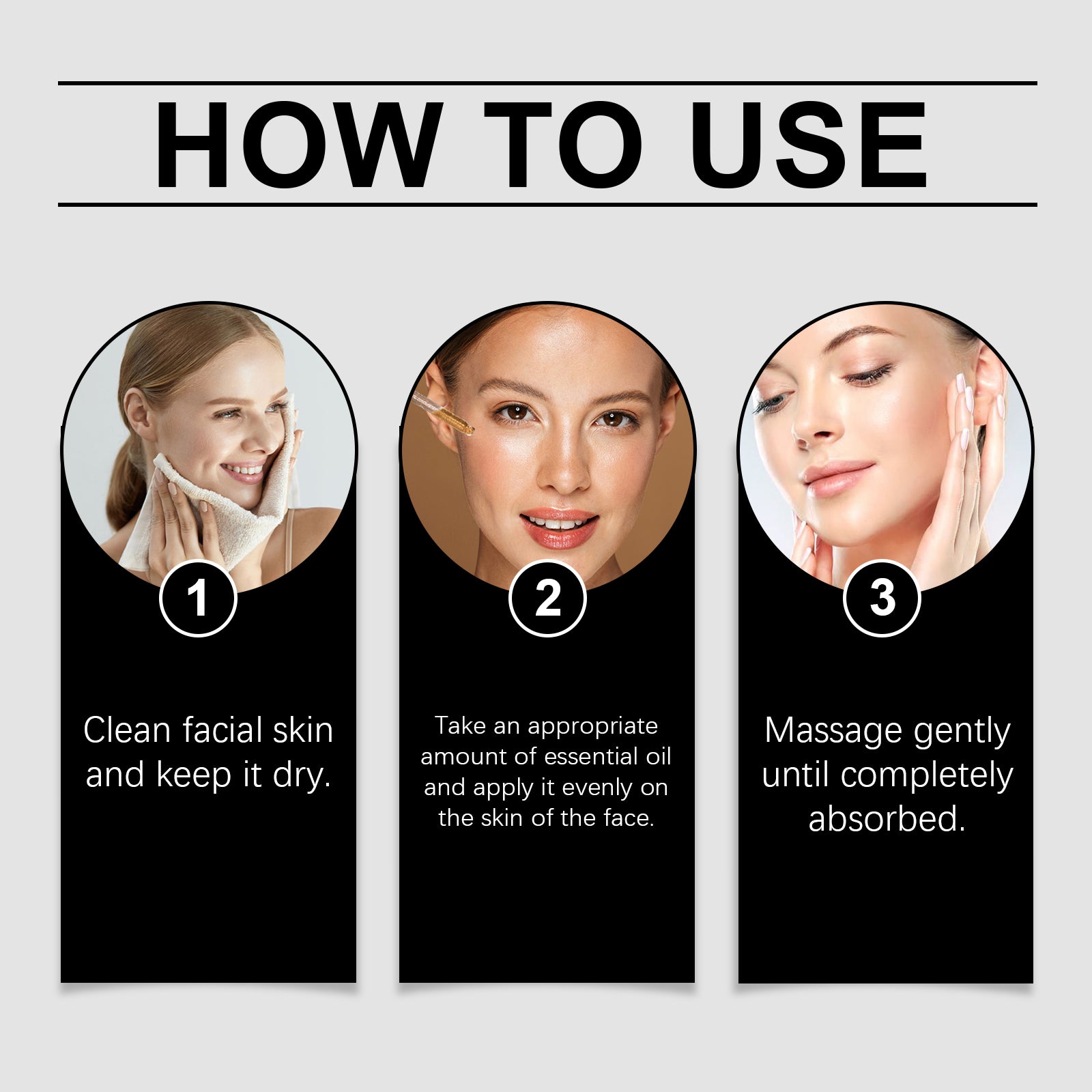 Our facial oils contain mineral oil, PEG-40 hydrogenated castor oil. It can moisturize without greasy, comfortable and effective to help relieve skin problems. Its application is simple: clean facial skin and keep it dry. Take appropriate amount of essential oil, evenly apply to face skin and gently massage until completely absorbed. And can improve skin relaxation, enhance elasticity.