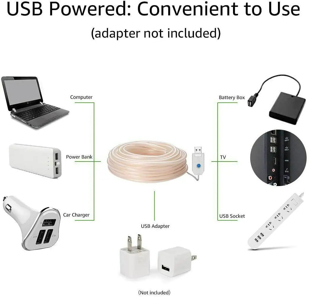 - 🎄USB Powered, NOT Battery Operated: It won't kill through your batteries. Benefit from the USB design, you can simply use a power bank to make it to be a portable string light and use it anywhere you want. You can hook it up to your existing phone USB charger and then plug it into the outlet.