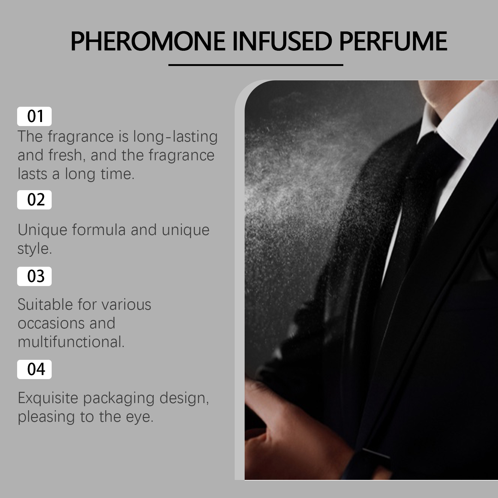 Our fresh cologne contains lemon fruit extract, amber extract and jasmine extract. It can provide fresh lemon aromas that add depth and complexity and bring an elegant fragrance. Its application is simple: 1. Spray the perfume on the wrists, neck and behind the ears. 2. Or spray the perfume into the air and then into the body, allowing the perfume to spread evenly throughout the body, leaving a strong aroma. The scent lasts all day. The bottle is elegantly designed for visual enjoyment.