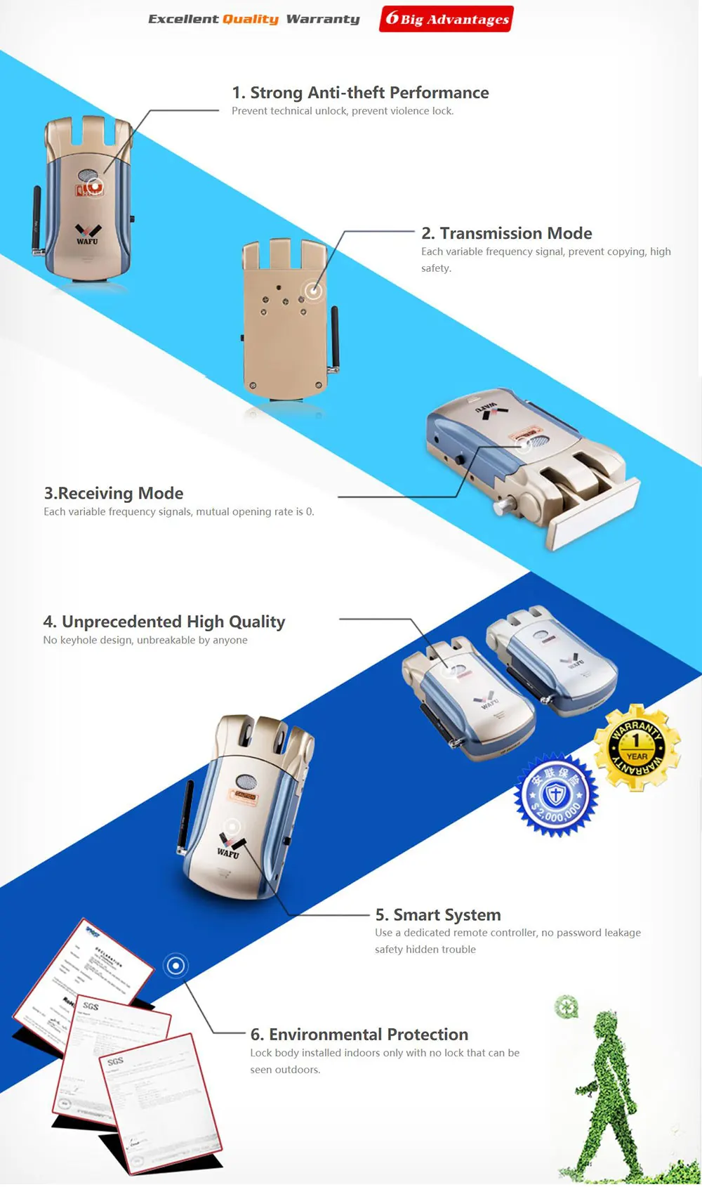 1. Strong Anti-theft Performance Prevent technical unlock, prevent violence lock. 2.Transmission Mode Each variable frequency signal, prevent copying, high safety. 3. Receiving Mode Each variable frequency signals, mutual opening rate is 0. 4. Unprecedented High Quality No keyhole design, unbreakable by anyone 5. Smart System Use a dedicated remote controller, no password leakage safety hidden trouble 6.Environmental Protection Lock body installed indoors only with no lock that can be seen outdoors.